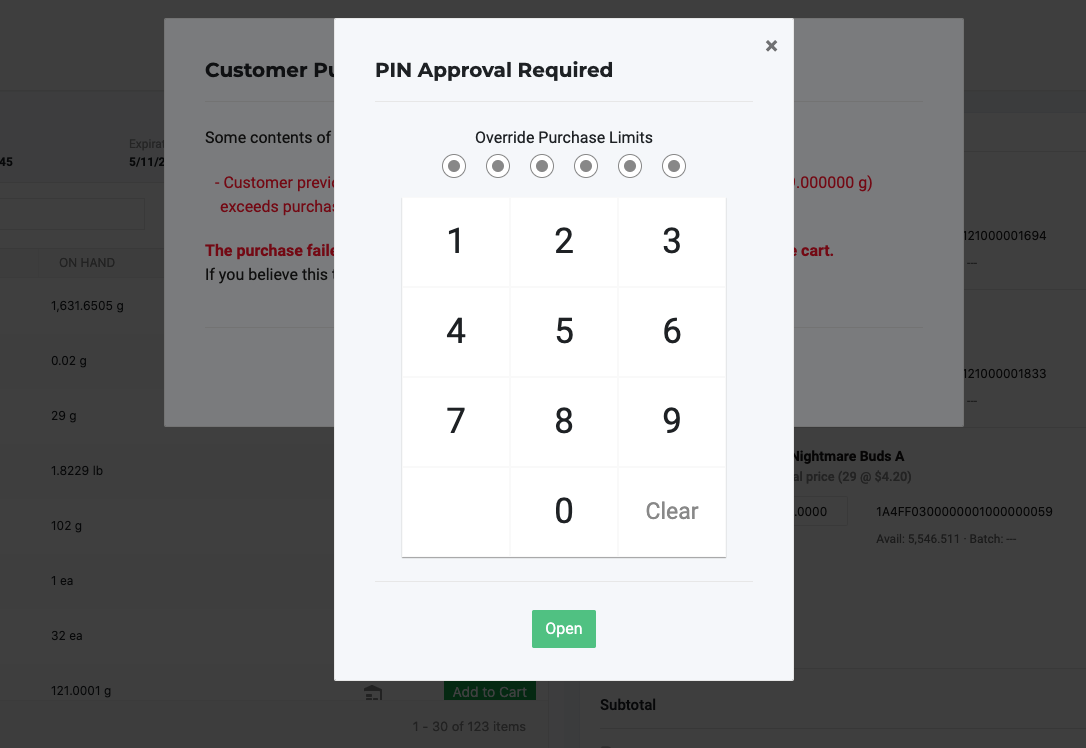 If you believe that the purchase limit validation is incorrect for whatever reason (e.g., perhaps a package's THC content was recorded with a decimal in the wrong place), Flourish will not prevent you from completing a sale. However, in order to Proceed, you will be asked to enter your PIN to override the validation.