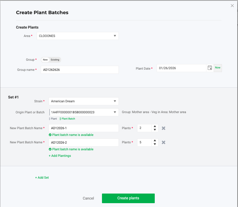 Click + Add Set to add another set of plant batches and repeat the configuration steps.