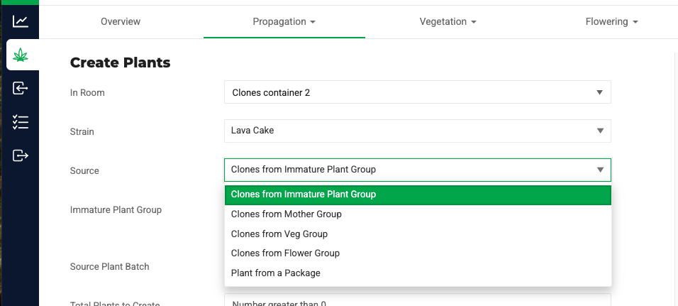 - Select Propagation/Create multiple plant batches to access the "Create Plant Batches" Screen