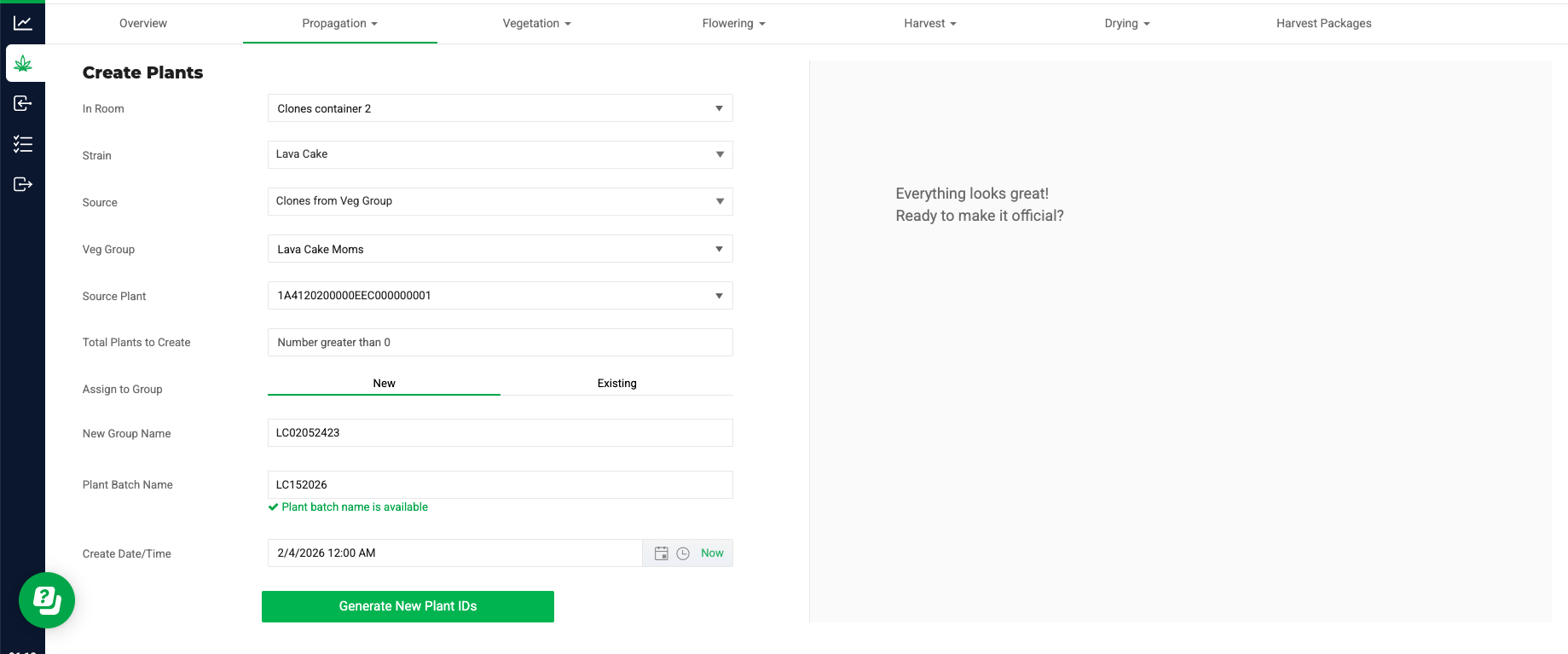 All plant batches and plants are created together. Group assignments and relationships are applied automatically, and the data is synced to METRC.