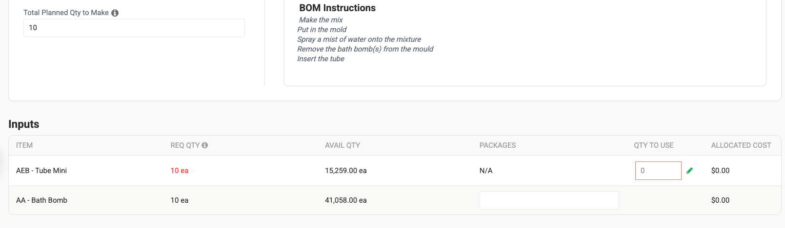 - Enter the Total Planned Qty to Make. This defines the required input amounts based on the BOM.