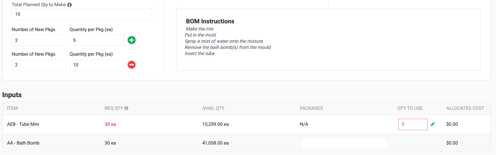 Make one or more packages of one or more sizes. The total output quantity can be larger or smaller than the Total Planned Qty to Make. The QTY TO USE can be larger or smaller than the REQ QTY to account for real-world variances. Costs will accumulate accordingly.