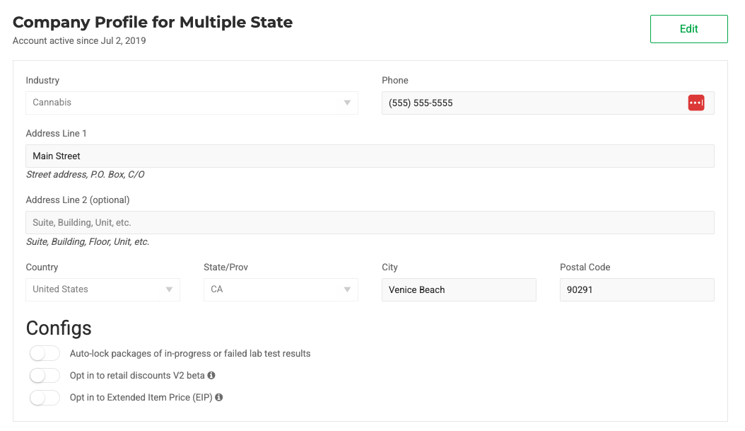 By default, company information is not editable. To enable editing, select the "Edit" button at the top right
