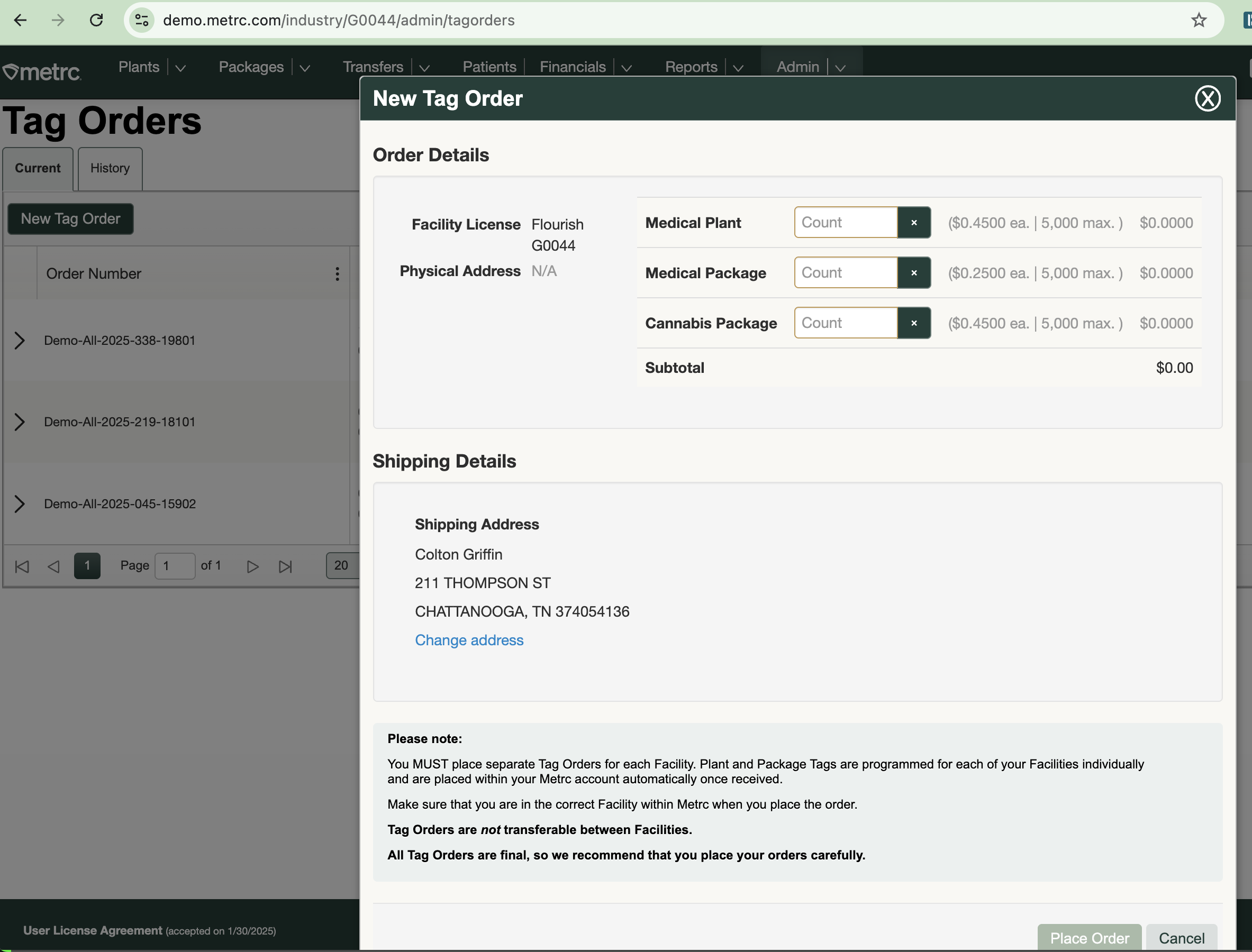 We recommend ordering enough Metrc tags to cover at least three months of activity, plus a 20% buffer—and if you can, go bigger.