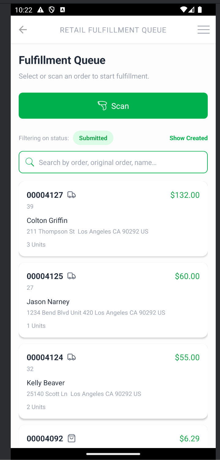 The fulfillment queue lists all open orders. By default, it shows "Submitted" orders ready to pack. Search for the order or just scan an order ID to get started.