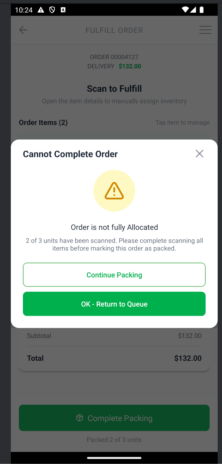 The system will alert you if the order isn't fully packed. This is OK. Either dismiss and finish packing or leave the order as partially allocated to deal with an exception and move on to packing other orders.