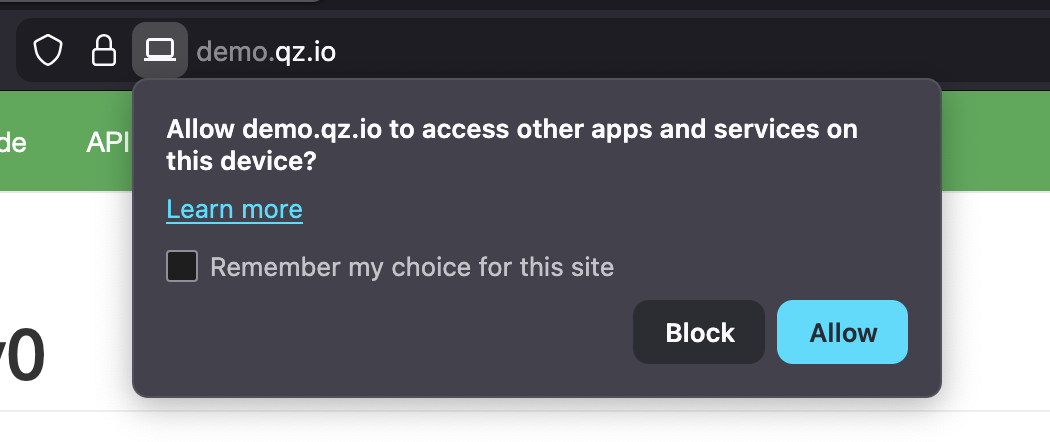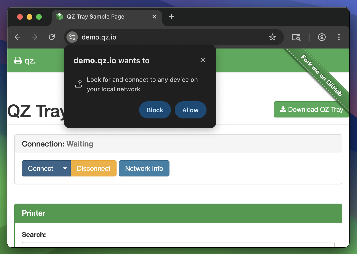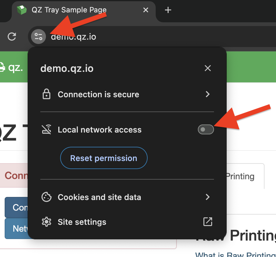 If you accidentally clicked “Block”, QZ Tray will not be able to connect to your printer until permissions are restored. Follow the steps below to re-enable Local Network Access for your browser.