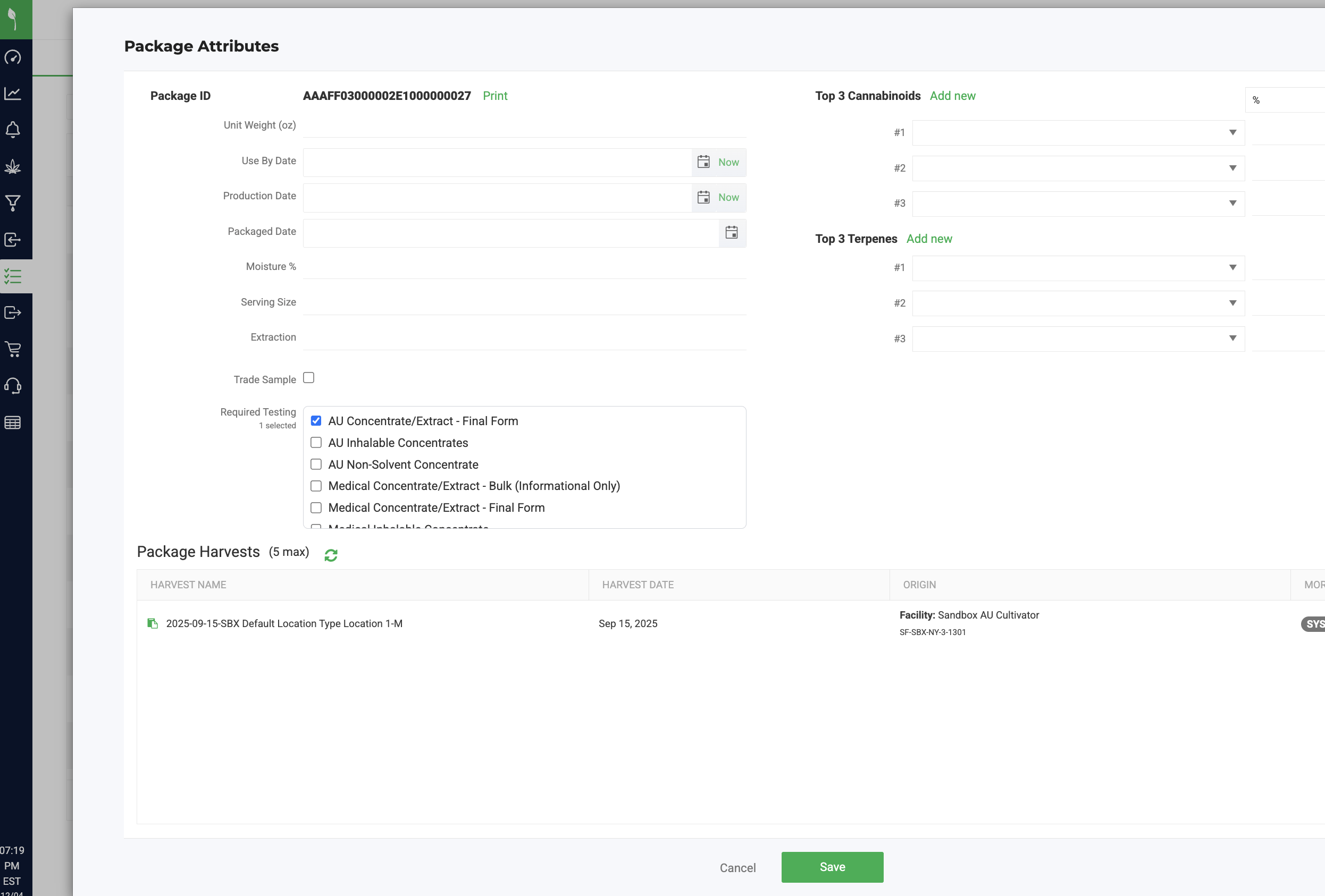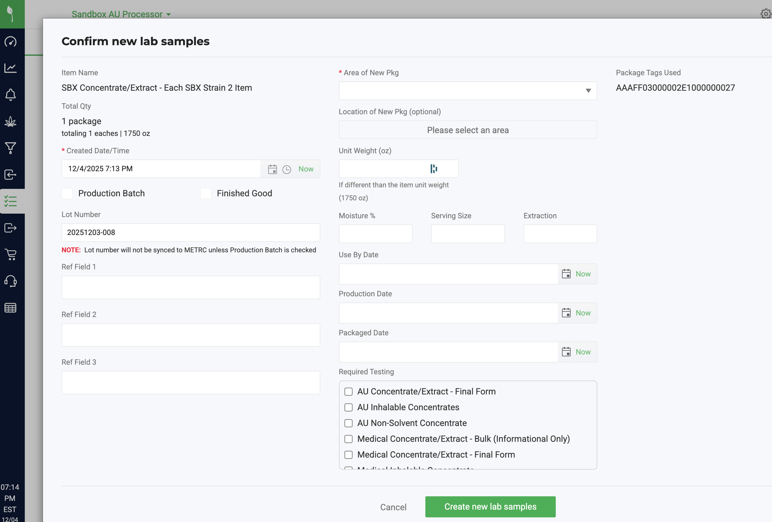 - If required by your state, a "Required Testing" section is available on the Package Confirmation screen. Select the required tests.