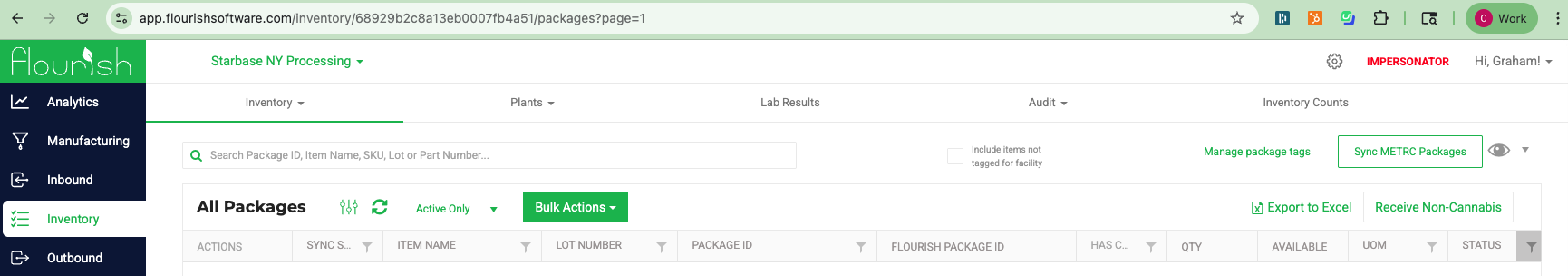 - In Flourish, click the Sync Metrc Packages here. NOTE: Log out and back in to see this.