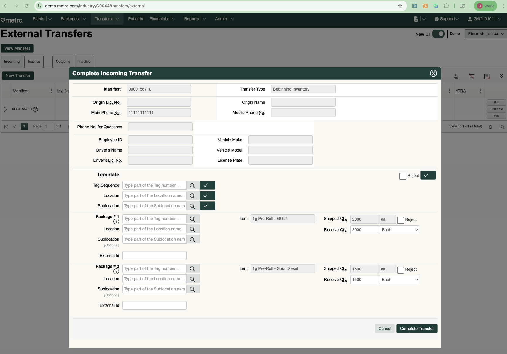 - Populate the Metrc tag and the area, and click "Complete Transfer" at the bottom of the screen to complete this process.