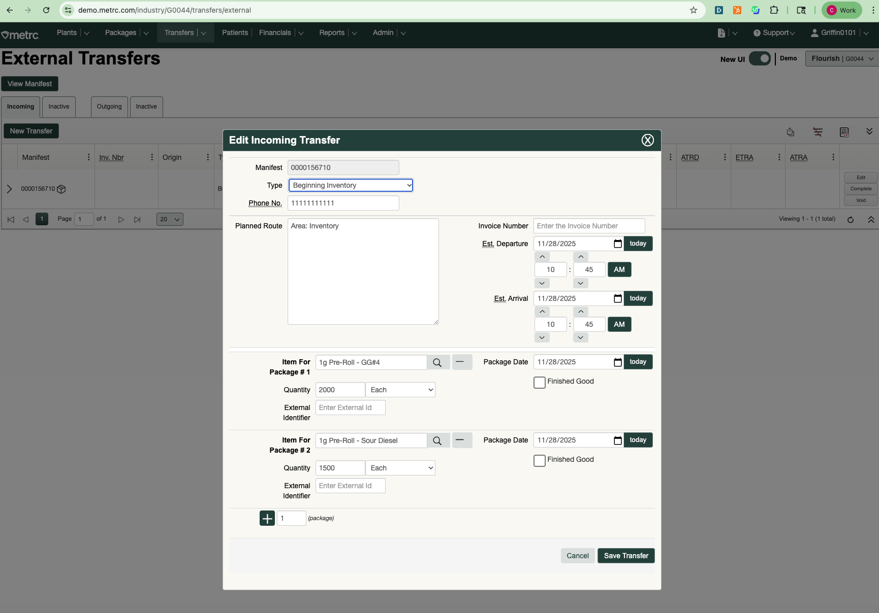 You then need to receive your inventory using an “External Transfers” within Metrc. Please assign the tags and accept them. Then, click the “Sync from Metrc” button within Flourish to import the newly received packages. All of the on-hand inventory will be converted to Metrc tags.