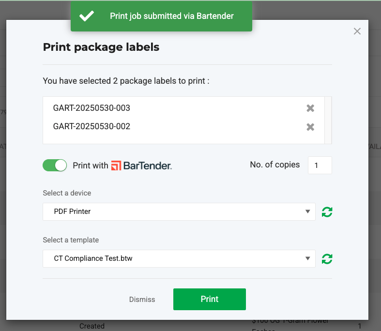 You can use the BarTender® integration to print package, product, or plant labels directly within Flourish.