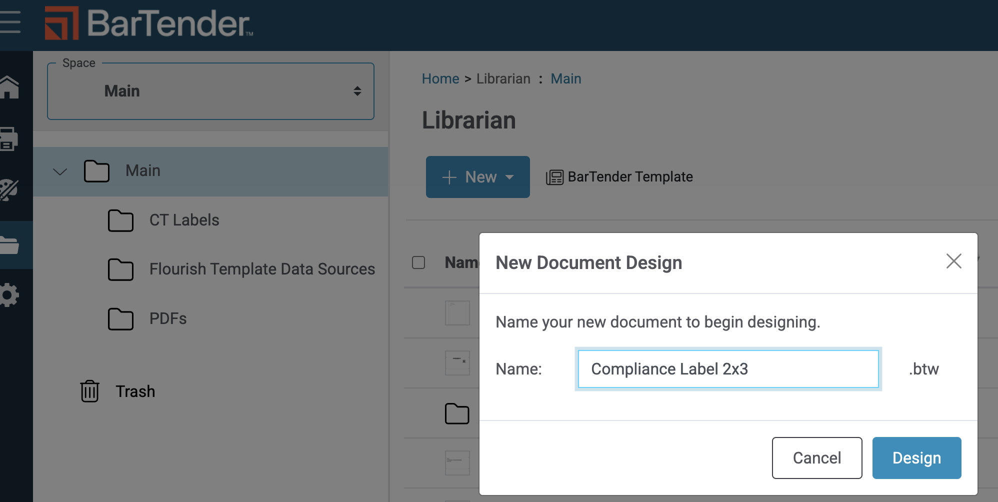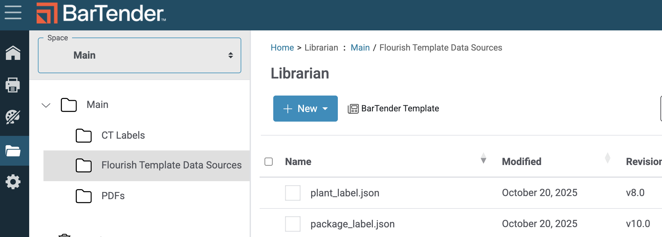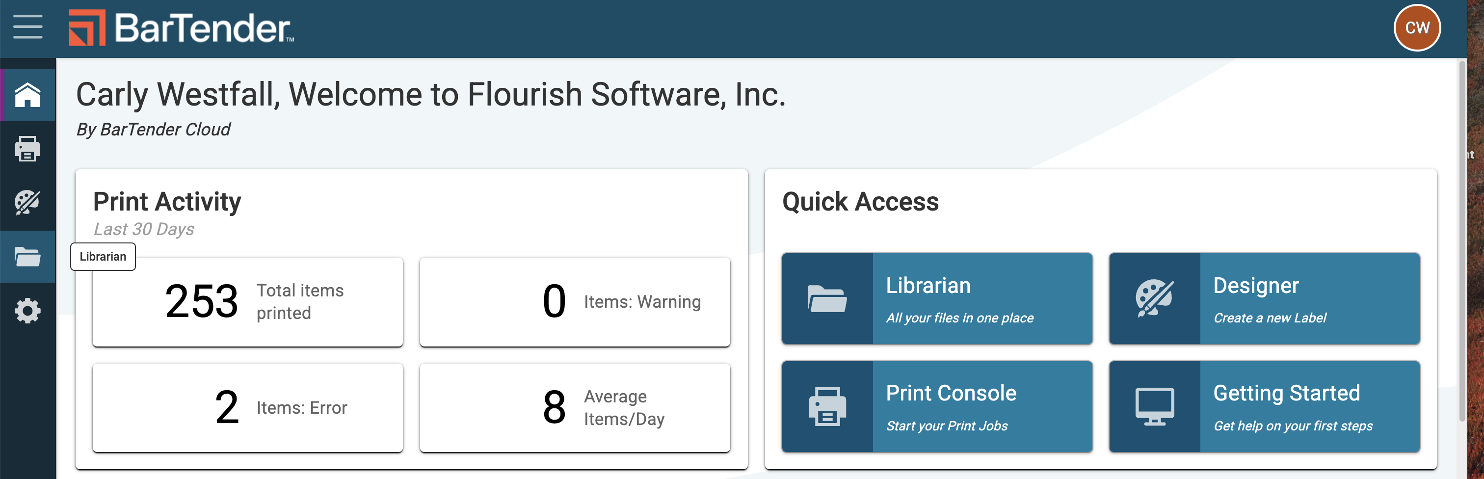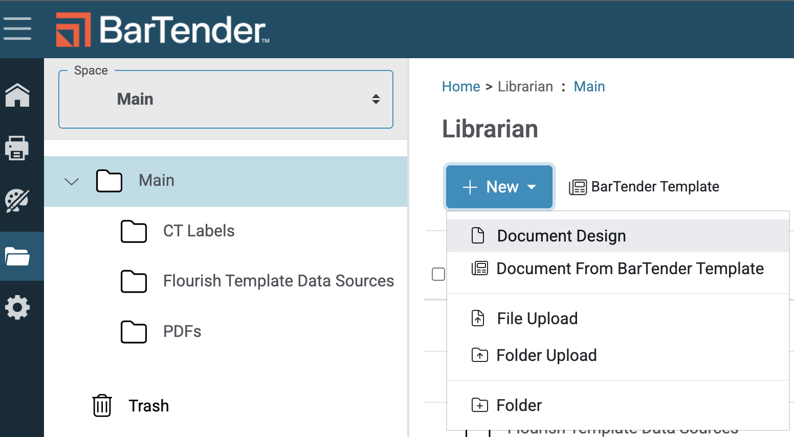 - To start with a new template, navigate to the BarTender Librarian. You can access from either the home screen's "quick access" page or on the left navigation menu (folder icon).