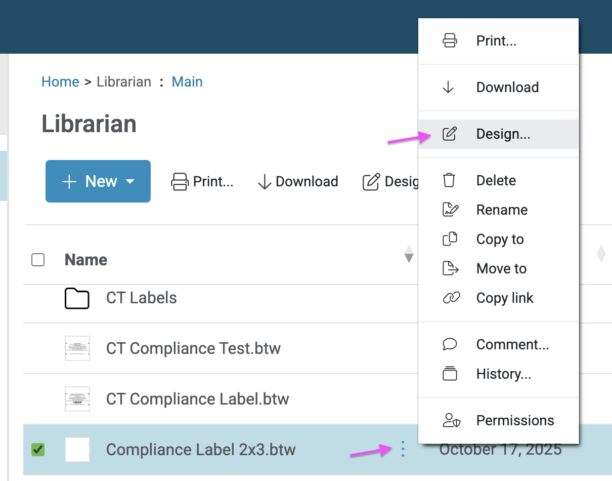 - Find your template in the Librarian and click on the 3 dots to the right of the filename. Click Design.