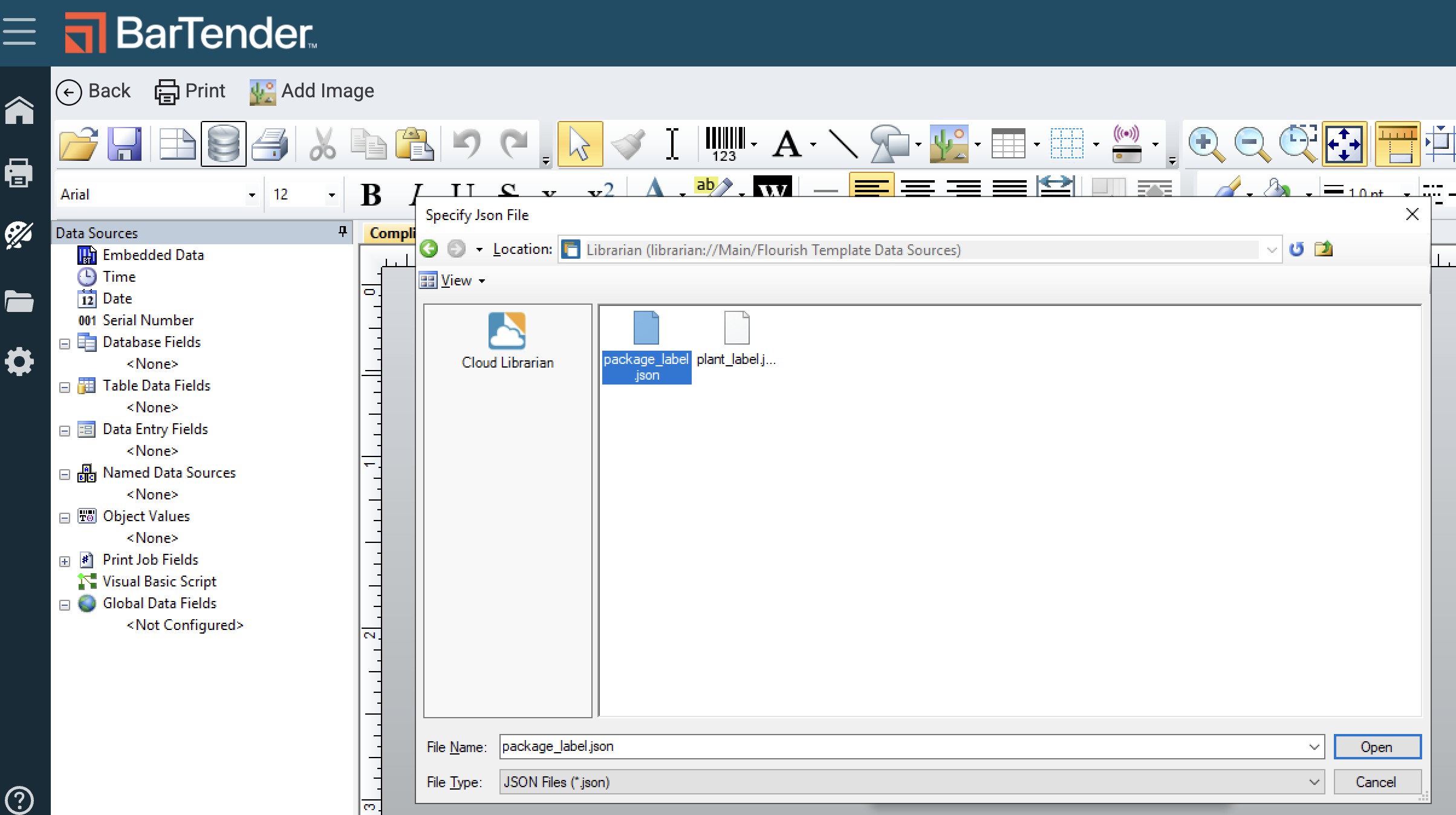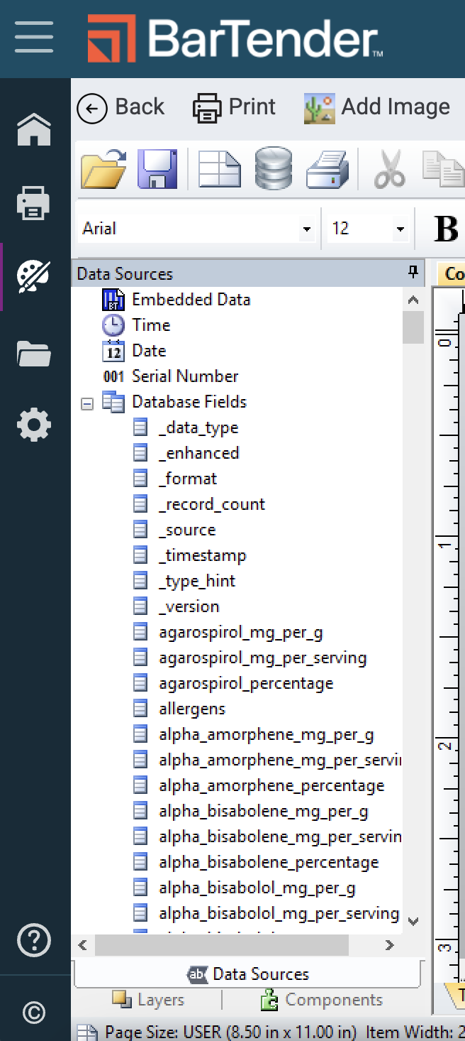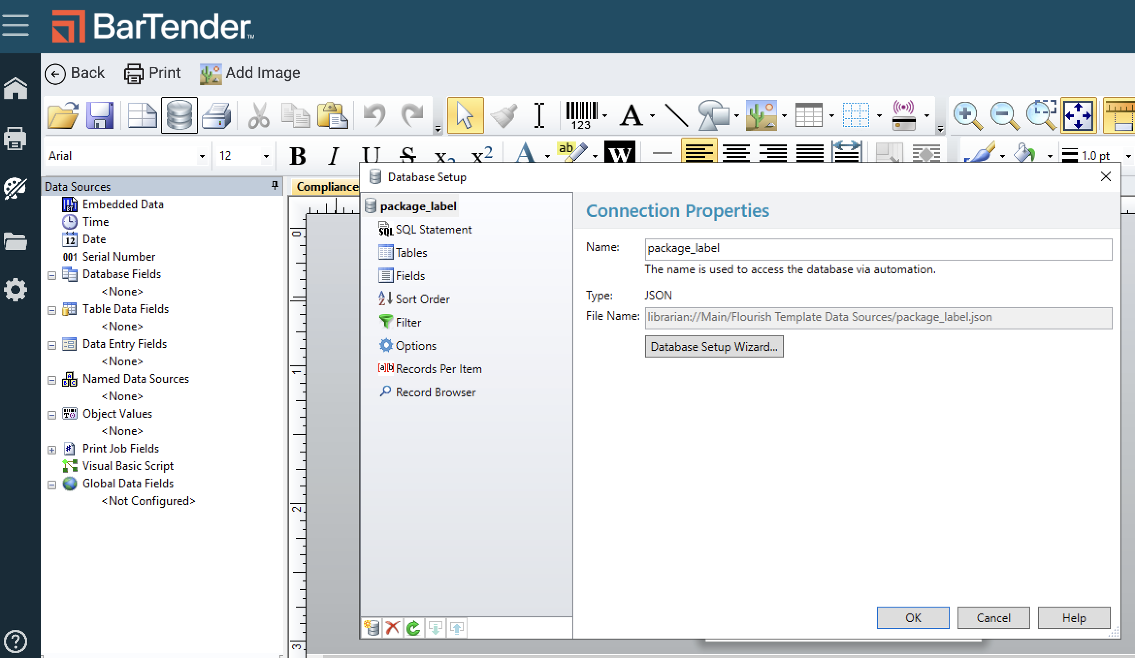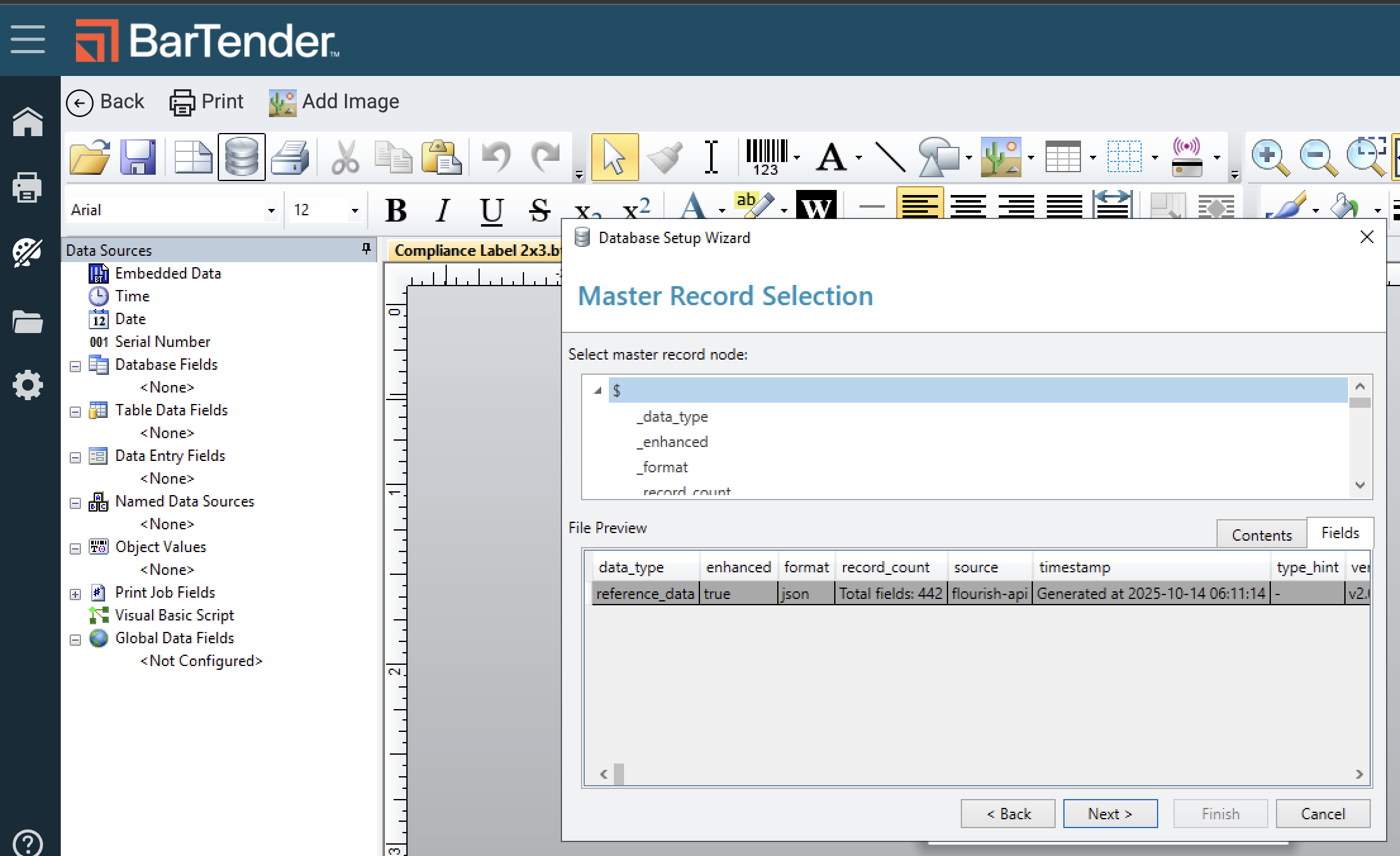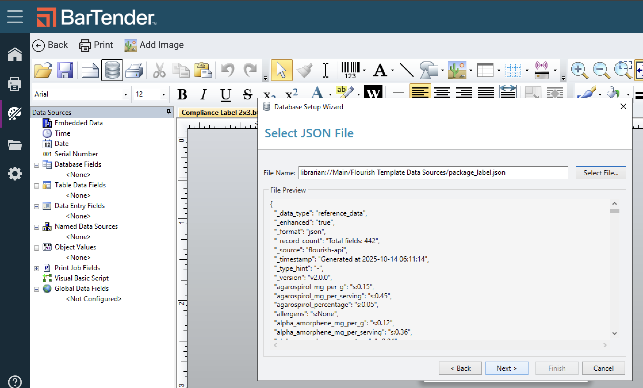 Connect the Flourish database fields to the Template file in BarTender so you can configure your label with integrated Flourish data.