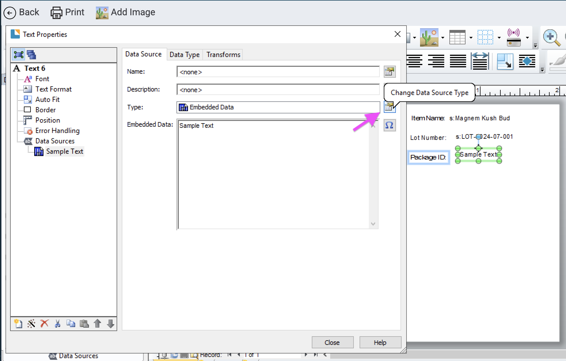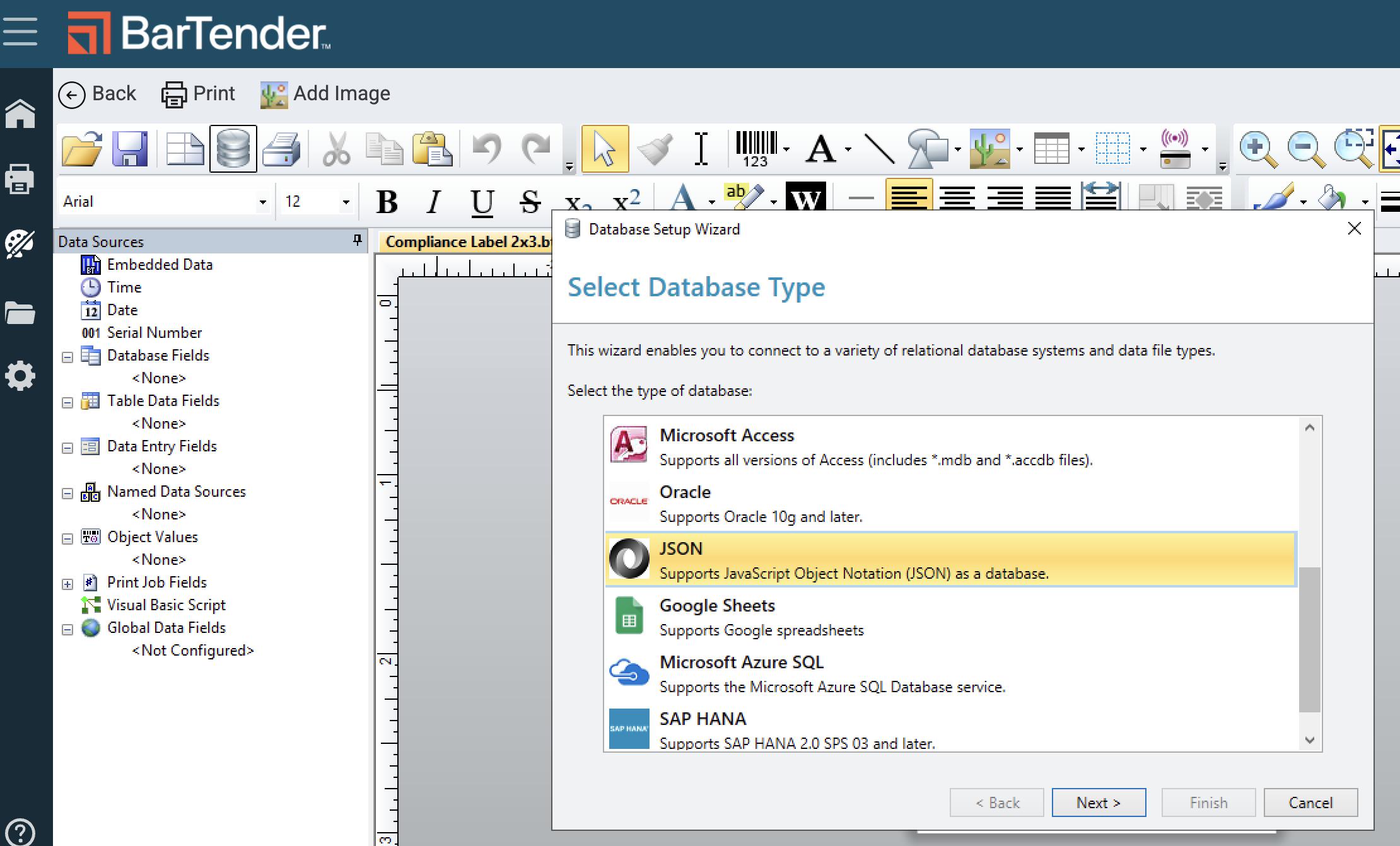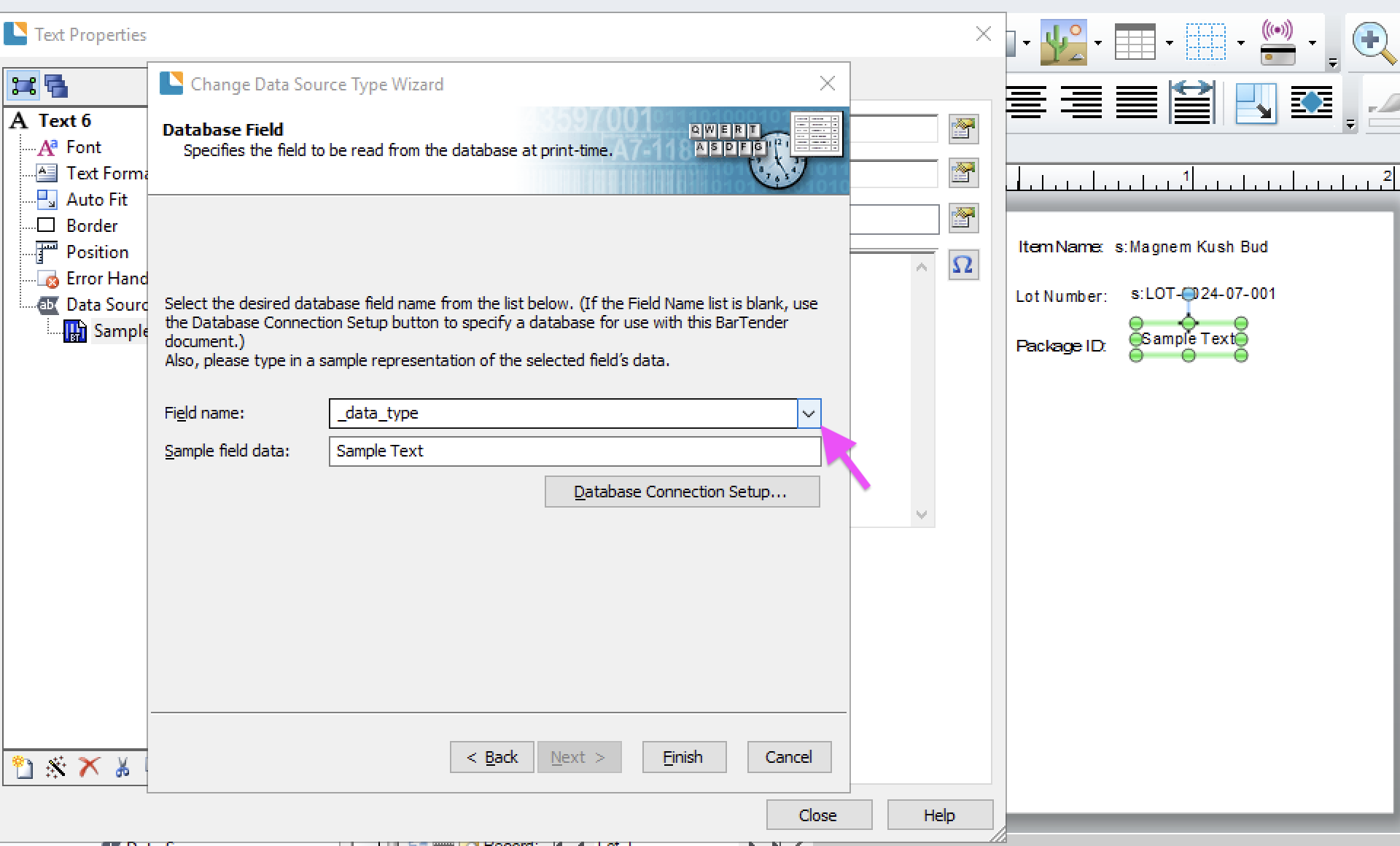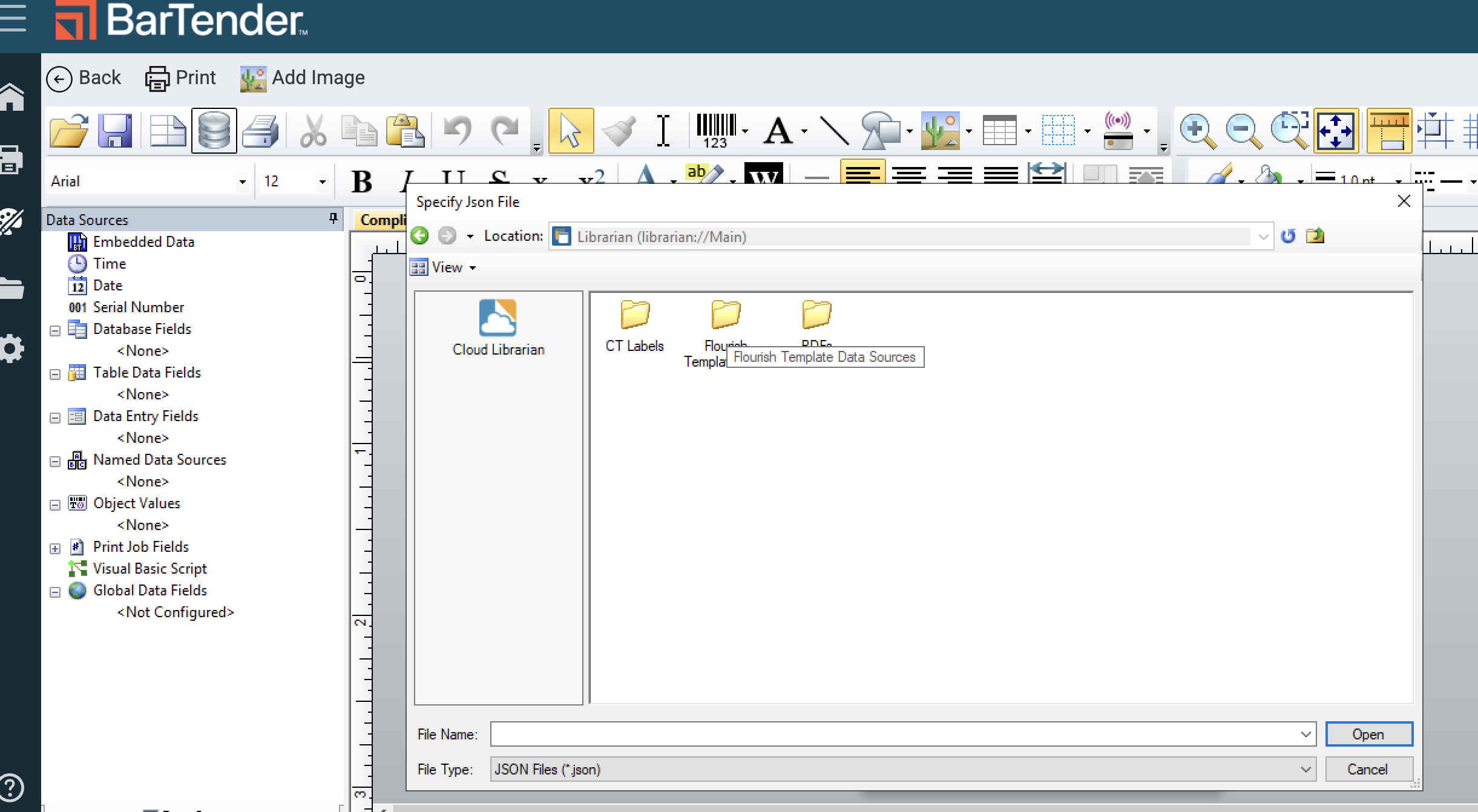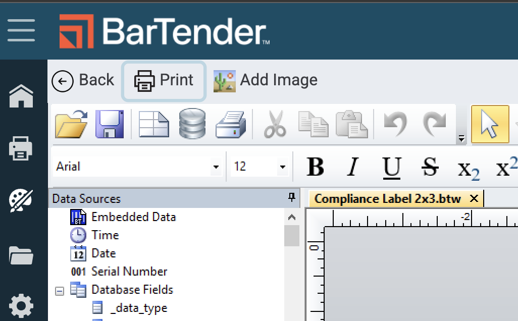 Connect the Flourish database fields to the Template file in BarTender so you can configure your label with integrated Flourish data.