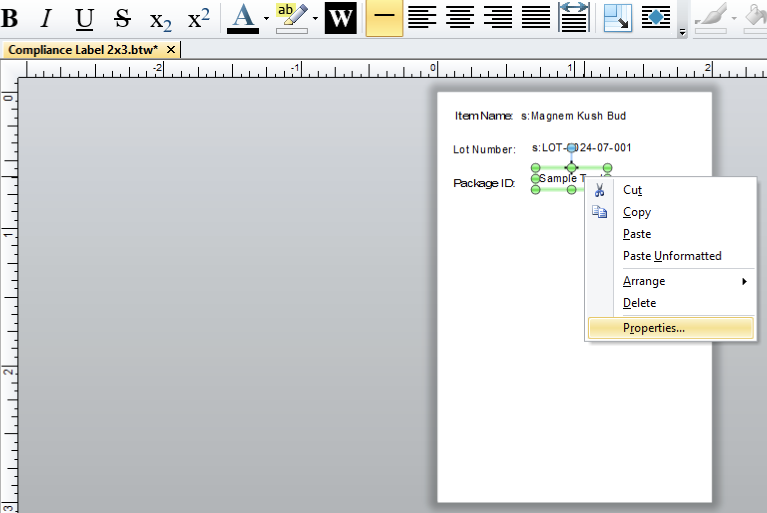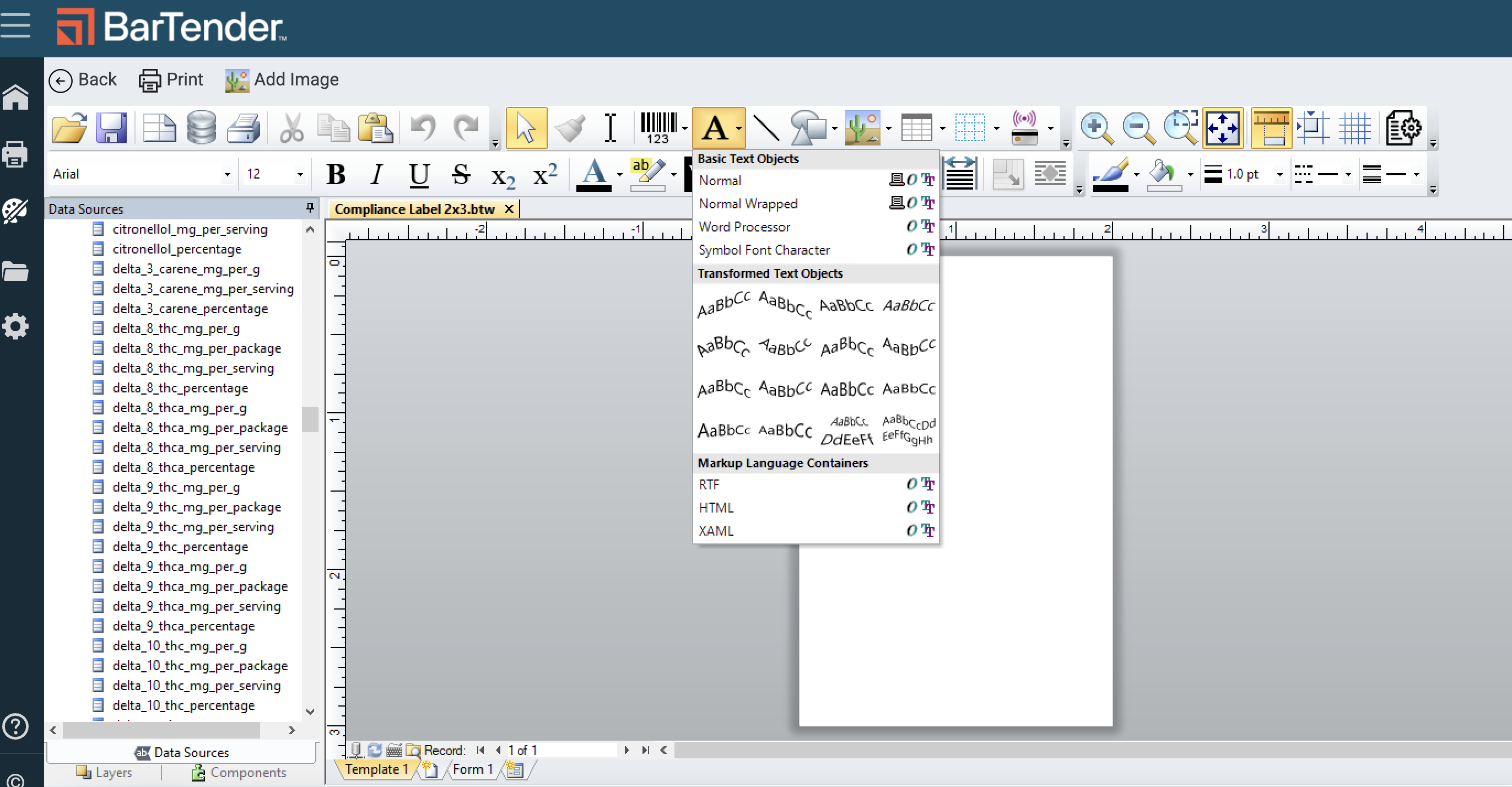 - Click the text box (A icon in the toolbar) to create a text field. This will be used for element headers and field mappings. It is standard to use Normal or Normal Wrapped if word wrapping is needed for Ingredients or Warnings.
