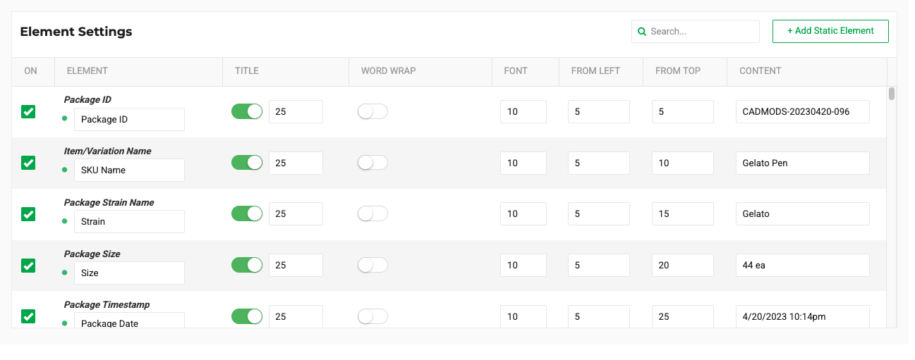 - Element – Select the data element you want to print (e.g., Package ID, Lot Number, COA Portal URL).