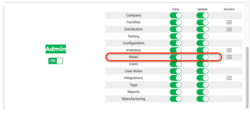 - On the Retail line, ensure the 'View' and 'Update' toggles ON.