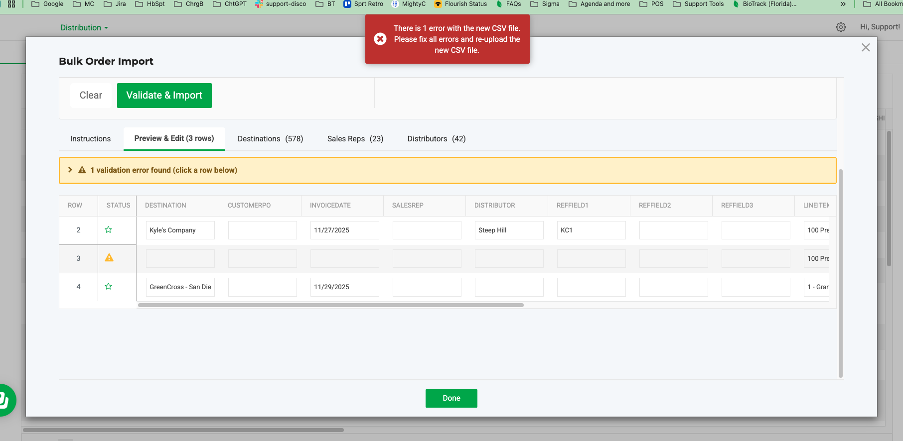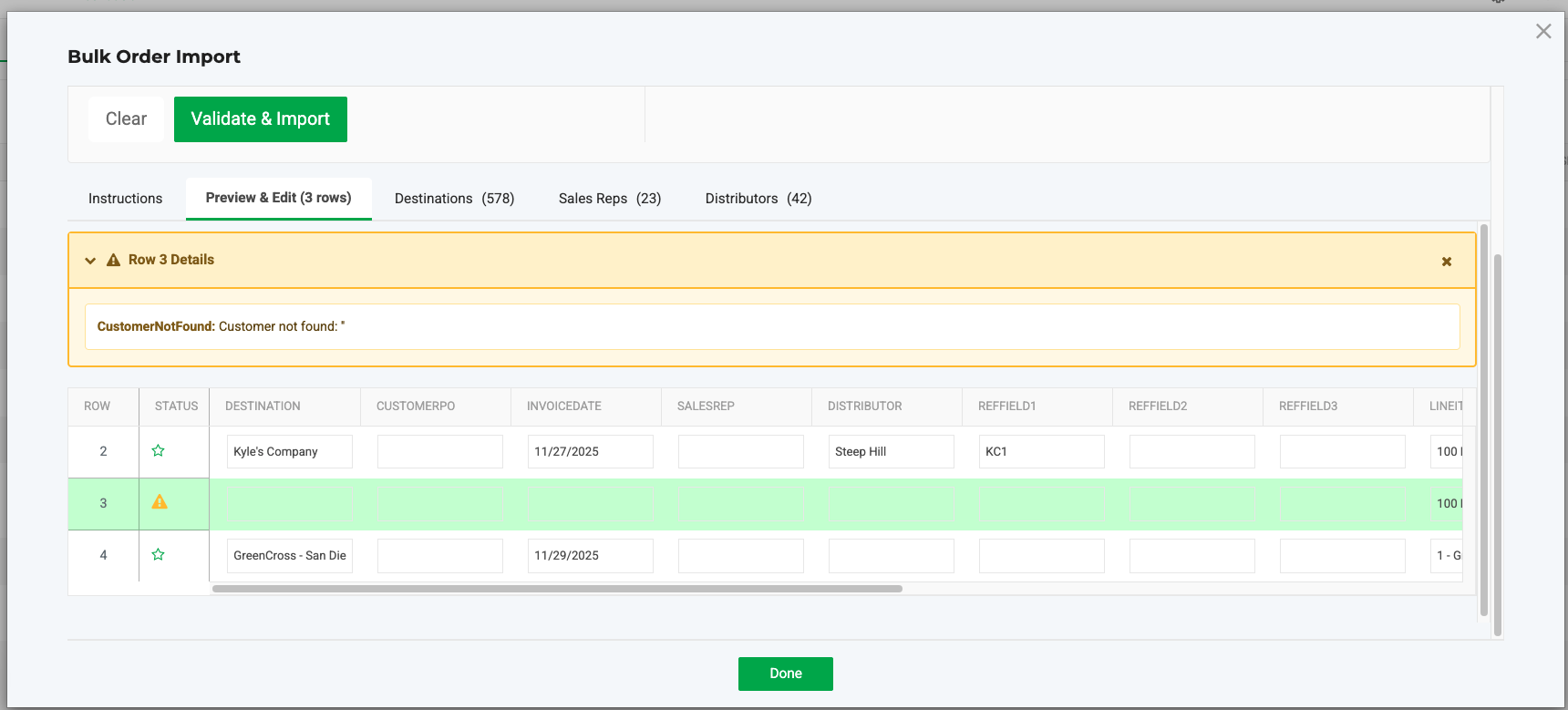 • Check the "Destinations", "Sales Reps", and "Distributors" tabs whenever you see repeated validation errors.