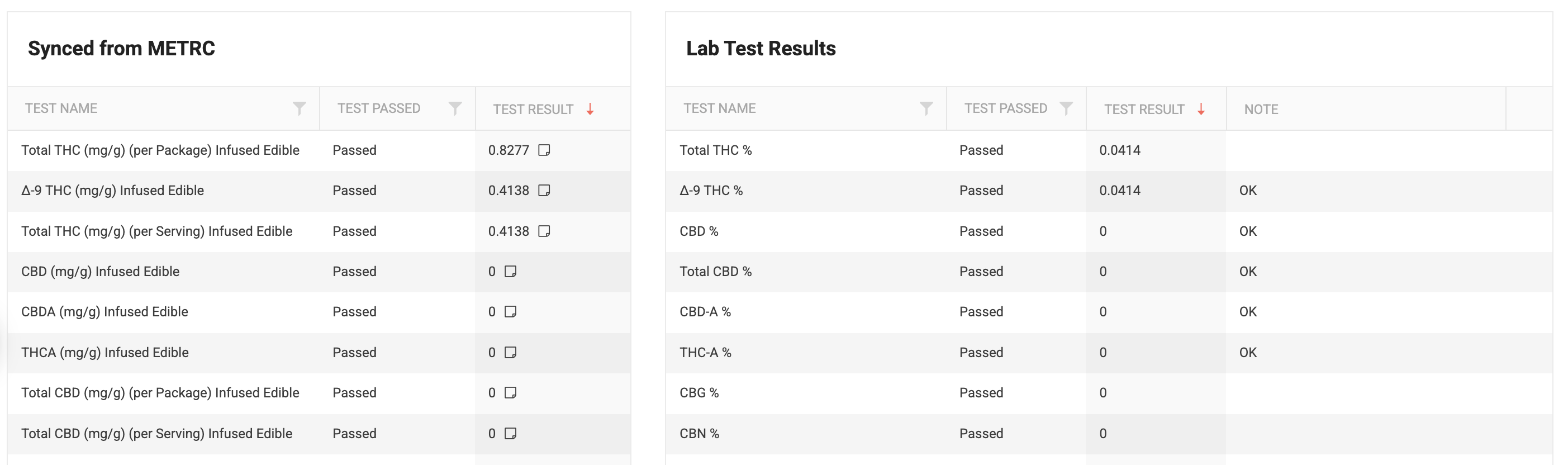 Example Metrc synced results mapped to Flourish standard result set