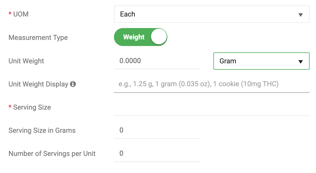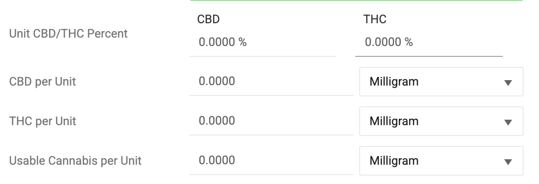 - Unit CBD/THC Percent – Expected formulated % of each. Required to sync to Metrc in certain states.
