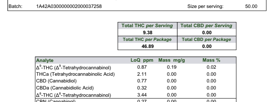 This should have a Serving Size in Grams of 50 and a Number of Servings per Unit of 5 to calculate the mg of THC. The COA reports in milligrams per gram, as shown here: