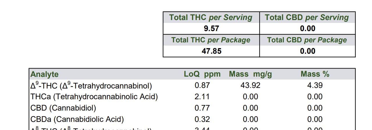 - Lab Test Result Delta-9 THC mg per unit (This is "Per Package" since Unit represents the net weight of the sellable packaged unit)